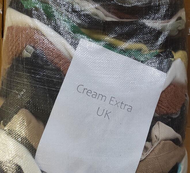 Odzież Cream Extra to odzież używana w stanie bardzo dobrym, praktycznie bez śladów użytkowania. Często też w pakietach w tej kategorii pojawiają się sztuki nowe z metkami. Cream Extra pochodzi z Irlandii lub Szkocji. Odzież w tej jakości to między innymi: